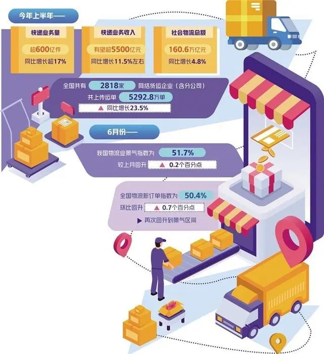 數(shù)據(jù)顯示,上半年,全國社會物流總額160.6萬億元,按可比價格計算,同比增長4.8%,比1月份至5月份提高0.3個百分點,二季度環(huán)比提高1.6個百分點,年內(nèi)物流需求累計增長整體呈回升態(tài)勢。6月份,中國物流業(yè)景氣指數(shù)為51.7%,較上月回升0.2個百分點,中國快遞發(fā)展指數(shù)為366.3,同比提升26.6%。