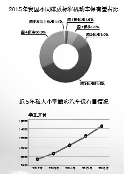 我國機(jī)動(dòng)車污染控制標(biāo)準(zhǔn)較低、起步較晚,全國平均機(jī)動(dòng)車單車污染物排放因子遠(yuǎn)高于發(fā)達(dá)國家。2014年,我國機(jī)動(dòng)車保有量為2.64億輛,按排放標(biāo)準(zhǔn)分類,國1前標(biāo)準(zhǔn)汽車占7.8%,國1標(biāo)準(zhǔn)汽車占14.9%,國2標(biāo)準(zhǔn)汽車占15.7%,國3標(biāo)準(zhǔn)汽車占51.5%,國4及以上標(biāo)準(zhǔn)汽車占10.1%。其中,占保有量僅7.8%的國1前標(biāo)準(zhǔn)汽車的污染物排放量占到了所有機(jī)動(dòng)車排放總量的35%以上,而占保有量61.6%的國3及以上標(biāo)準(zhǔn)汽車的排放量還不到總量的30%。據(jù)此估算,若所有機(jī)動(dòng)車均能達(dá)到國3及以上標(biāo)準(zhǔn),那么汽車污染物排放量可下降50%左右。根據(jù)《2016年中國機(jī)動(dòng)車環(huán)境管理年報(bào)》的最新數(shù)據(jù),2015年國3及以上標(biāo)準(zhǔn)機(jī)動(dòng)車保有量占比已達(dá)到83.5%,我國對機(jī)動(dòng)車排放標(biāo)準(zhǔn)的控制力度進(jìn)一步加大。