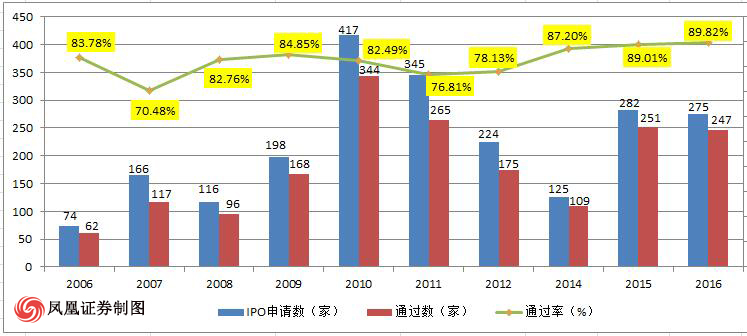 記者統(tǒng)計(jì)了近十年以來(lái)的IPO數(shù)據(jù),盡管十年間新股發(fā)行共經(jīng)歷5次暫停(分別為2005.5-2006.6、2008.9-2009.6、2012.10-2014.1、2014.1-2014.6、2015.6-2015.12),但是整體上看新股發(fā)行的通過(guò)率呈現(xiàn)波動(dòng)式上升的趨勢(shì)。其中,從2011年以來(lái),新股發(fā)行的通過(guò)率實(shí)現(xiàn)逐年連升,2016年更是創(chuàng)下近十年新高的89.82%的整體通過(guò)率。