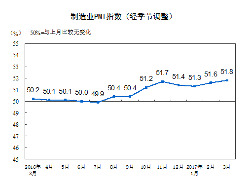 中國經(jīng)濟(jì)網(wǎng)北京3月31日訊 據(jù)國家統(tǒng)計(jì)局網(wǎng)站消息,2017年3月份,中國制造業(yè)采購經(jīng)理指數(shù)(PMI)為51.8%,連續(xù)兩個(gè)月上升,高于上月0.2個(gè)百分點(diǎn),制造業(yè)持續(xù)保持穩(wěn)中向好的態(tài)勢。