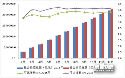 2016年,全國社會物流總額229.7萬億元,按可比價格計算,比上年增長6.1%,增速比上年提高0.3個百分點。分季度看,一季度50.7萬億元,上半年107.0萬億元,前三季度167.4萬億元,比上年同期增長6.0%,6.2%,6.1%,增速比上年同期分別提高0.4個百分點,0.5個,0.3個百分點。總體來看,全年社會物流總額呈現(xiàn)穩(wěn)中有升的發(fā)展態(tài)勢,物流需求結構持續(xù)改善。